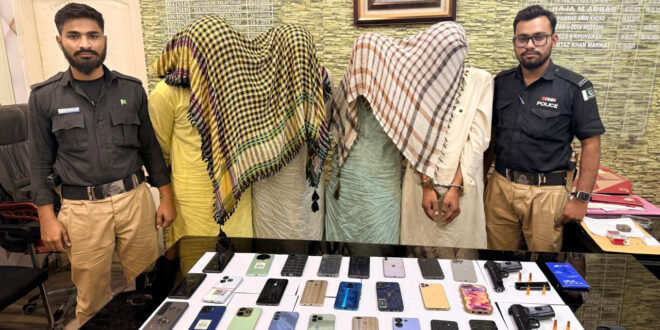 ملزمان سے 25 قیمتی فون،2 پستول،موبائل فون کی آی ایم آی تبدیل کرنے والی ڈیوائس بھی ملی ہے