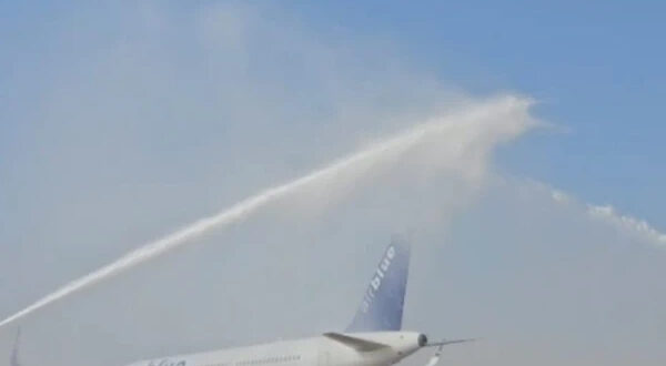 طیارے کی لینڈنگ پر پاکستان ائیرپورٹس اتھارٹی نے واٹرسیلیوٹ دیا۔