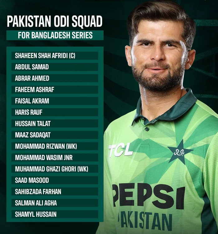 پاکستان کرکٹ بورڈ نے بنگلادیش کے خلاف 3 میچوں پر مشتمل ون ڈے سیریز کے لیے 15 رکنی اسکواڈ کا اعلان کر دیا۔